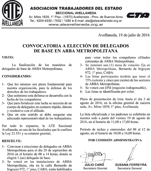 ATE convoca a elección de delegados de base en ARBA Metropolitana
