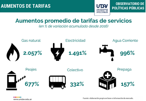 Como agravante de este panorama, los rubros relativos al pago de las tarifas de servicios aumentaron casi 50% más que el nivel general del índice de precios; es decir que las tarifas de los servicios públicos aumentaron aun por encima de la inflación.