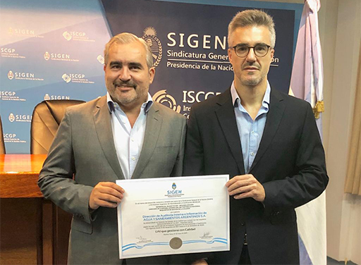 Este diploma, que fue recibido por el miembro del directorio de AySA, Pablo Walter y el gerente de Auditoría Interna, Martín Ameglio; es otorgado por la Sindicatura General de la Nación (SIGEN), órgano rector del Sistema de Control Interno del Poder Ejecutivo Nacional. Está destinado a las Unidades de Auditoría Interna que logran certificar y/o recertificar los “Requisitos de Gestión de Calidad”, correspondientes al Referencial N°13 (IRAM-SIGEN). La presente norma se encuentra fundamentada en la nueva versión de la Norma ISO 9001 (IRAM): “Sistemas de Gestión de Calidad”.