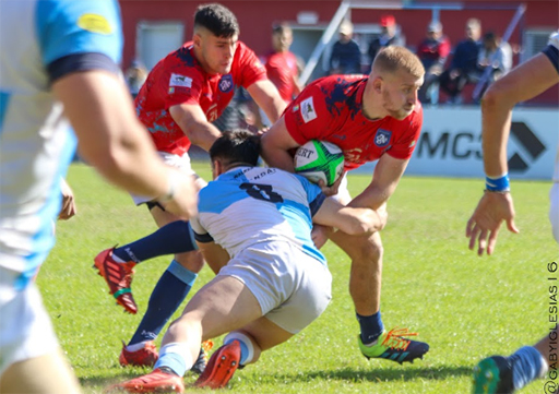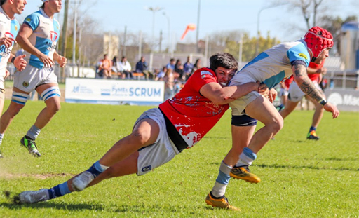 El picante segunda línea del CAR Federico Chapela, quiebra el intento de tackle de su rival. Fue muy productivo penetrando la defensa rival y anotó uno de los try del Tino. Foto: Gaby Iglesias