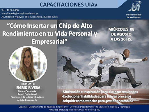 La Unión Industrial de Avellaneda invita a participar, el próximo miércoles 8 de agosto a las 16hs, de la charla que organiza el Departamento de Jóvenes Empresarios. La misma estará destinada a fomentar la motivación y los ejes que mejoren la productividad y eficiencia. La cita es en la sede de la institución ubicada en Av. Hipólito Yrigoyen 355 de Avellaneda. Coordina el Departamento de Educación, Ciencia y Tecnología.
