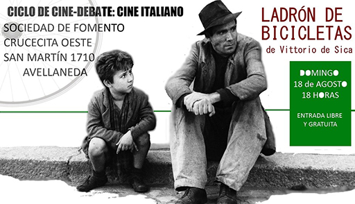 En el marco del ciclo de cine italiano que organiza la Sociedad de Fomento Crucecita Oeste, este domingo 18 de agosto a las 18 horas, proyectarán el film Ladrón de bicicletas de Vittorio de Sica. Al finalizar habrá debate.