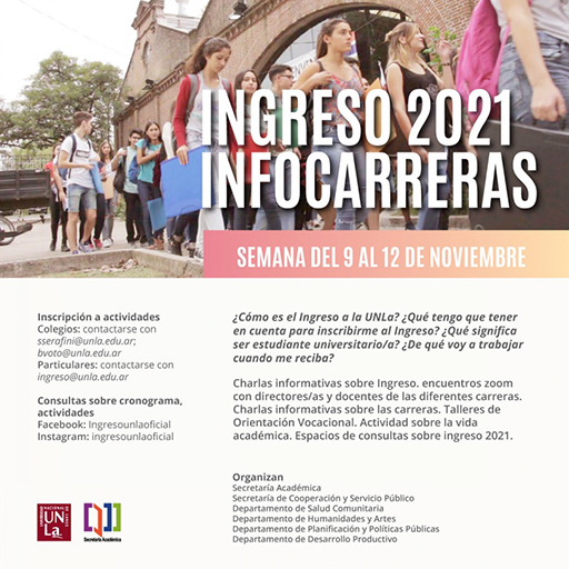 ¿Qué puedo estudiar? ¿Cómo ingreso a la universidad? ¿Qué tengo que tener en cuenta para inscribirse? ¿De qué voy a trabajar? Son algunos de las preguntas que surgen una vez que se termina el secundario. Por eso, desde hoy y hasta el próximo jueves -12 de noviembre- la Universidad Nacional de Lanús (UNLa) organiza Infocarreras, una propuesta virtual abierta a la comunidad, que incluye talleres de orientación vocacional y charlas sobre las propuestas académicas, la vida universitaria y los trámites de ingreso.