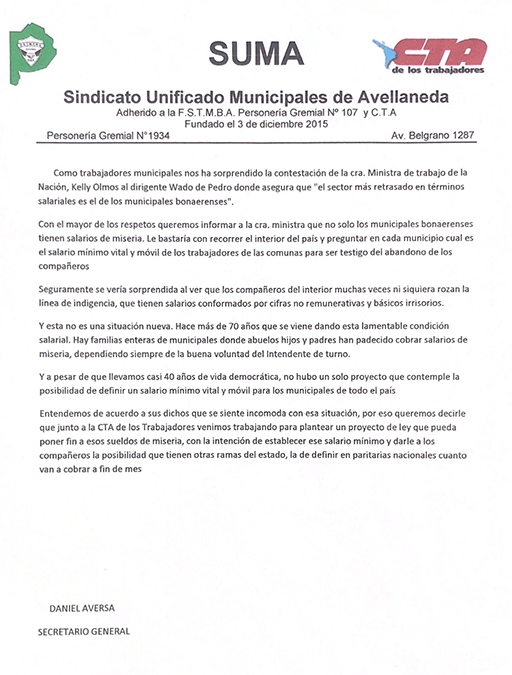 Comunicado del Sindicato Unificado Municipales de Avellaneda