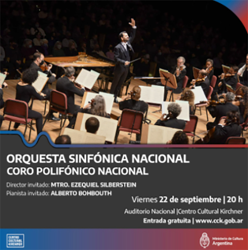 La Dirección Nacional de Elencos Estables de la Secretaría de Gestión Cultural (Ministerio de Cultura de la Nación) presenta a la Orquesta Sinfónica Nacional presenta que el viernes 22 de septiembre, a las 20 horas, en la Sala Auditorio Nacional del CCK (Sarmiento 151, CABA) ofrecerá un concierto, con el Mtro. Ezequiel Silberstein como Director invitado, el Coro Polifónico Nacional y el pianista invitado Alberto Bohbouth.