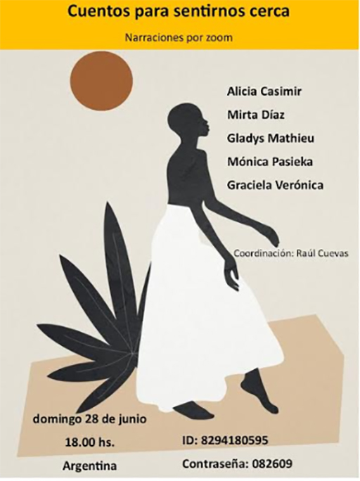 Cuentos para sentirnos más cerca 24 junio, 2020 / Agenda Participarán Alicia Casimir, Mirta Díaz, Gladys Mathieu, Mónica Pasieka, Graciela Verónica. Coordina: Raúl Cuevas. Zoom: ID 8294180595. Contraseña: 082609.
