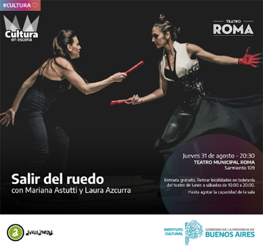 El Instituto Cultural de la Provincia de Buenos Aires llega con su programa “Cultura en Escena” a Avellaneda. En esta oportunidad se presentará la obra “Salir del Ruedo” en el Teatro Municipal Roma (Sarmiento 109). La función será el jueves 31 de agosto a las 20.30. Las entradas son gratuitas y se retiran en la boletería del teatro de lunes a sábados de 10.00 a 20.00, hasta agotar la capacidad de la sala.