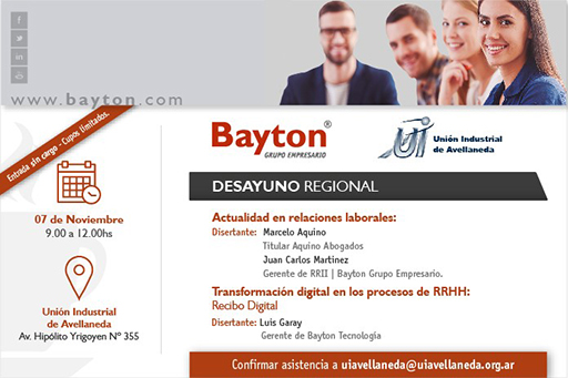 La Unión Industrial de Avellaneda invita a un desayuno de trabajo para todos los dueños de empresas y personal de las áreas de recursos humanos que realizarán junto a la consultora Bayton, el martes 7 de noviembre de 9 a 12hs, en la sede de la institución sita en la Av. Hipólito Yrigoyen 355 de Avellaneda.