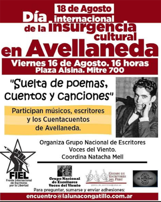 Este viernes 16 de agosto a las 16 horas, en Plaza Alsina, se celebrará el Día Internacional de la insurgencia cultural en Avellaneda. Habrá suelta de poemas, cuentos y canciones. Participan músicos, escritores y los cuentacuentos de nuestra ciudad.