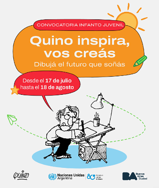 La Ciudad de Buenos Aires, a través del Ministerio de Cultura, junto a la Organización de las Naciones Unidas (ONU) Argentina y la familia de Joaquín Salvador Lavado (Quino) presentan la convocatoria “Quino inspira, vos creás: dibujá el futuro que soñás”, una invitación a niños y adolescentes a expresarse con creatividad e imaginación.