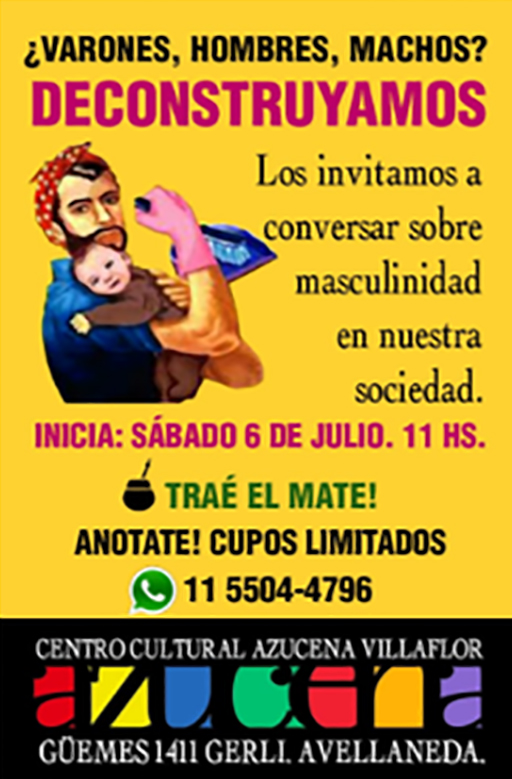 El Centro Cultural Azucena Villaflor ubicado en Güemes 1411, Gerli invita a la charla sobre el tema “¿Varones, hombres, machos? Deconstruyamos” donde se abrirá un espacio para conversar sobre la masculinidad en nuestra sociedad.