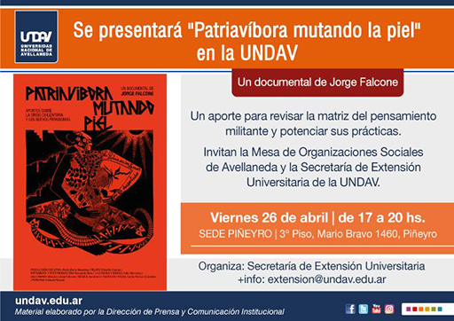 El viernes 26 de abril se proyectará el documental de Jorge Falcone: Patriavíbora mutando piel. Apuntes para la crisis civilizatoria y los nuevos paradigmas. Un documental para revisar la matriz del pensamiento militante y potenciar sus prácticas” un trabajo necesario “ante la imperiosa necesidad de aunar la problemática social con la ambiental”.