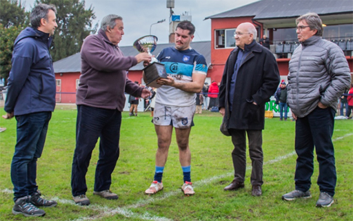 Jorge Farfalla le entrega la copa que lleva su nombre a Facundo Angeletti capitán de la primera división. A su derecha Rodrigo Reymondes presidente del CAR. Junto al capitán, Ricardo “Tete” Gordo Llobell fundador y ex presidente del CAR, a su lado Santovito ex presidente de Lanús Rugby. Foto: Diego Madorran.