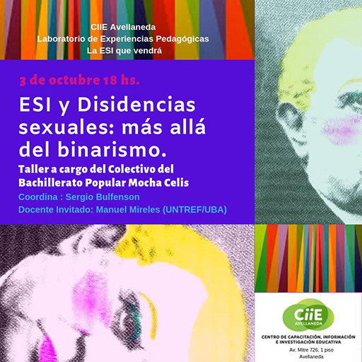 Este jueves 3 de octubre a las 18 hs, se realizará una conversación-taller sobre la ESI y las disidencias sexuales: más allá del binarismo, a través de la experiencia de Bachillerato Popular Trans Mocha Celis, a cargo del Prof. Manuel Míreles y coordinada por el Prof Sergio Bulfenson, con entrada libre en Av. Mitre 726 Avellaneda.