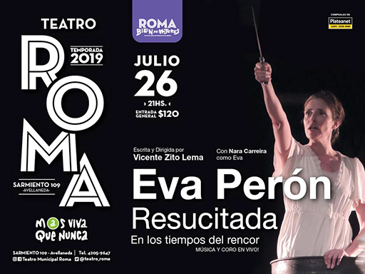“Eva Perón Resucitada” es una ceremonia teatral donde Vicente Zito Lema, su autor, revive a una conmovedora Eva, personificada por la actriz Nara Carreira. La obra es a la vez una expresión poética y una rigurosa forma de resistencia cultural en días que el autor califica como “tiempos del rencor”.