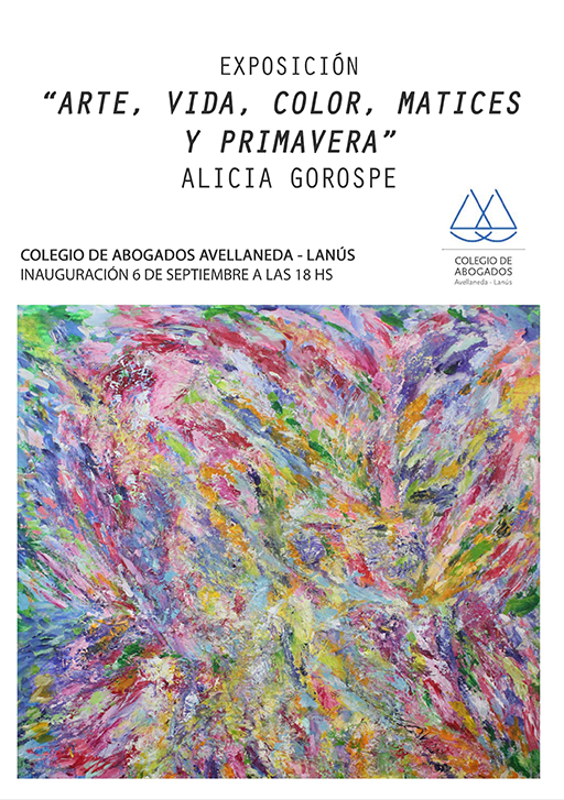 La comisión de cultura del Colegio de Abogados Avellaneda Lanús, con sede en la calle Gdor. Carlos Tejedor 203 de Lanús Oeste, invita a la inauguración de la muestra “Arte, vida, color, matices y primavera” de Alicia Gorospe, que se llevará a cabo este viernes 6 de septiembre, a las 18 horas.