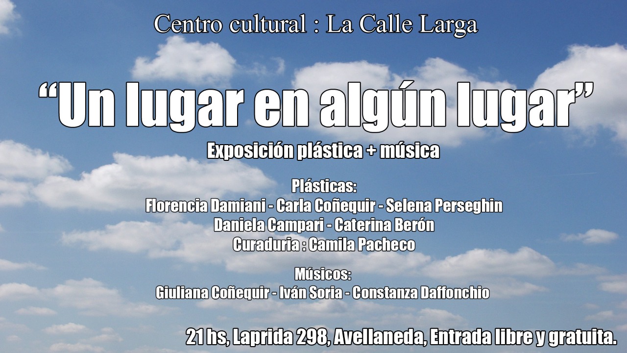 En el Centro Cultural La Calle Larga -Laprida 298, Avellaneda-, está sábado 28 de julio a las 21 horas, presentarán la exposición de plástica y música “Un lugar en algún lugar”, con la participación en plástica de Florencia Damiani, Carla Coñequir, Selena Perseghin, Daniela Campari, Caterina Berón. Curaduría: Camila Pacheco. Músicos: Giuliana Coñequir, Iván Soria y Constanza Daffonchio.