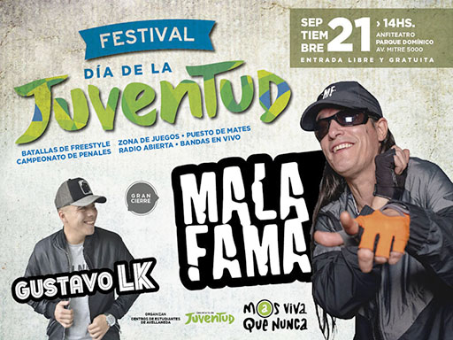 La Municipalidad de Avellaneda festeja el Día de la Juventud este sábado 21 de septiembre con un Festival gratuito que se llevará a cabo en el Anfiteatro Parque Domínico -Av. Mitre al 5000- a partir de las 14 horas.