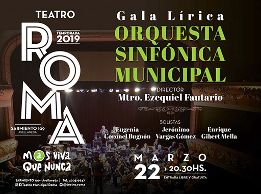 Este viernes 22 marzo a las 20,30 horas, en el Teatro Roma, de la mano del Maestro Ezequiel Fautario, la Orquesta Sinfónica Municipal de Avellaneda ofrecerá su primer concierto del año, con la participación de los solistas Eugenia Coronel Bugnón, Jerónimo Vargas Gómez y Enrique Gilbert Mella.