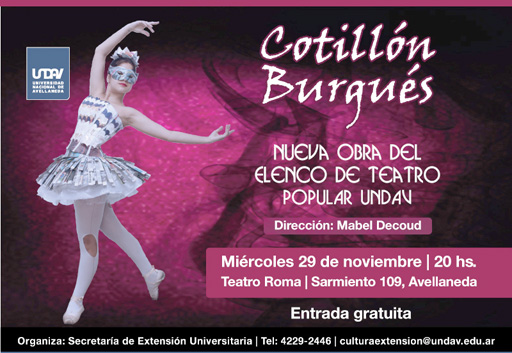 La Universidad Nacional de Avellaneda invita a disfrutar de la nueva obra de teatro “Cotillón Burgués” a cargo del elenco de Teatro Popular UNDAV, el miércoles 29 de noviembre a las 20hs en el Teatro Roma, Sarmiento 109 – Avellaneda.