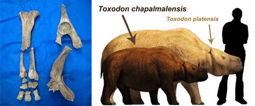 Los Toxodontes eran un género con varias especies que existieron en nuestro continente.En el mismo museo ya se exhiben restos de un Toxodon platensis, del tamaño de un rinoceronte que fueron hallados en sedimentos más “modernos”, o sea de unos 500.000 años.