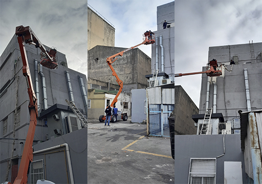 Para abordar este problema, se decidió intervenir en los conductos de chapa de zinc, que conectan los equipos de climatización instalados en las construcciones de planta baja con los quirófanos del segundo piso. Se aplicó espuma de poliuretano en el exterior de estos conductos, seguido de una capa de pintura acrílica. Además, parte de los muros de carga también fueron tratados con este método.