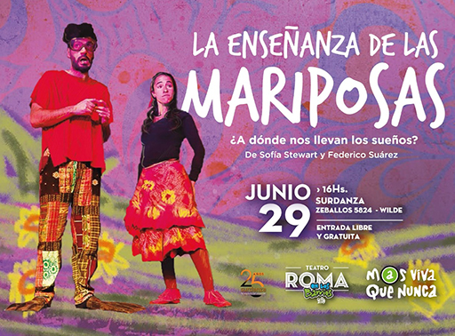 Este sábado ¡Surdanza se viste de fiesta!. En el marco del programa municipal Roma en Barrios se presenta a las 16 horas con entrada libre y gratuita, la obra para toda la familia La enseñanza de las mariposas, ¿A dónde nos llevan los sueños? de Sofía Stewart y Federico Suárez.