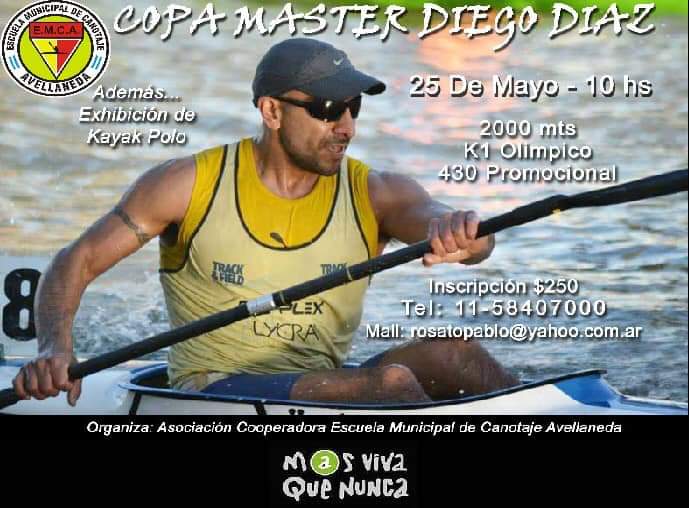 Organizado por la Asociación Cooperadora de la Escuela Municipal de Canotaje de Avellaneda, el sábado 25 de mayo a partir de las 10 horas en Juan Díaz de Solís y Hernán Cortés, Sarandí, se llevará a cabo la Copa Master Diego Díaz, en las categorías 2000 mts, K1 Olímpico y 430 Promocional. Además habrá exhibición de Kayak Polo.