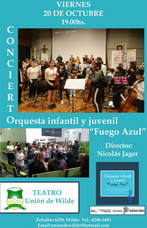 La Orquesta Infantil y Juvenil “Fuego Azul” ofrecerá un concierto en el Teatro Unión de Wilde, bajo la dirección de Nicolás Jager, este viernes  20 de octubre, a las 19 hs.