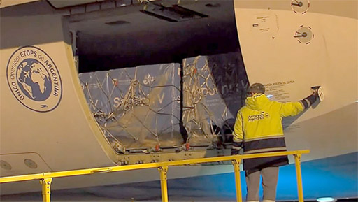 Como en los vuelos anteriores, las vacunas producidas por el instituto Gamaleya fueron trasladadas en contenedores del tipo “thermobox” a una temperatura de 18 grados bajo cero y con carga adicional de refrigeración.