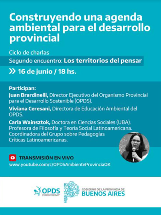 En esta oportunidad, el ciclo contará con la presencia de Carla Wainsztok, doctora en Ciencias Sociales, profesora de Filosofía y Teoría Social Latinoamericana y coordinadora del Grupo sobre Pedagogías Críticas Latinoamericanas. Estará acompañada por el director Ejecutivo del Organismo Provincial para el Desarrollo Sostenible (OPDS), Juan Brardinelli, y por la directora de Educación Ambiental, Viviana Ceresani.