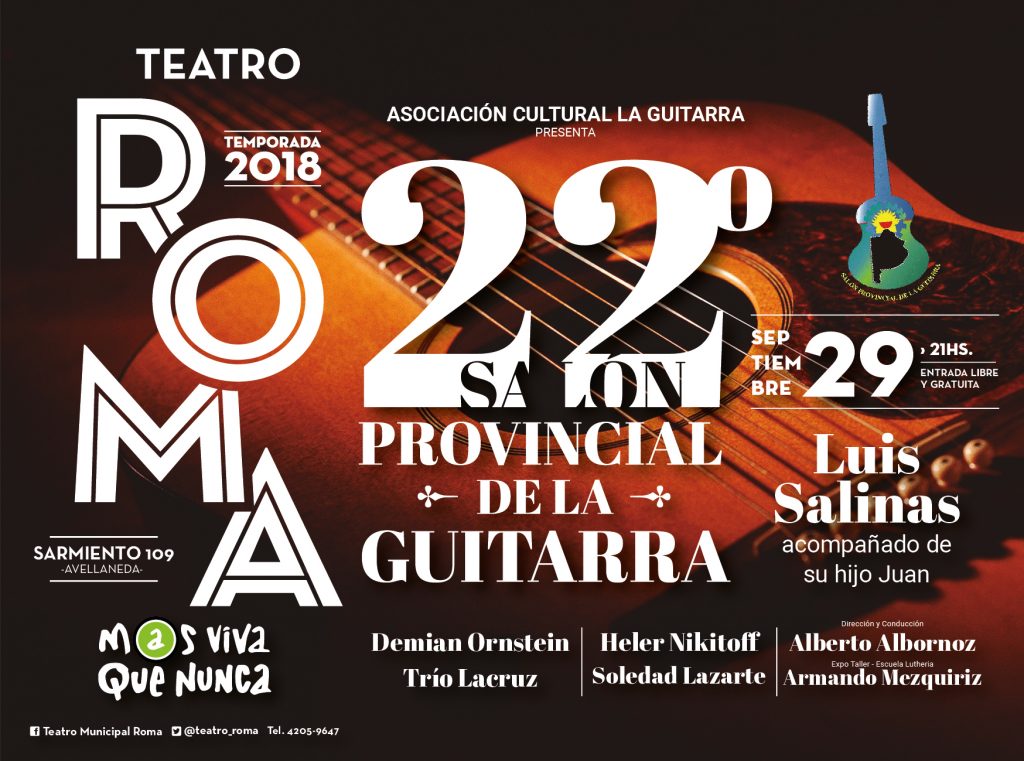 El sábado 29 de septiembre a las 20.30 horas se realizará el Vigésimo Segundo Salón Provincial de la Guitarra, organizado por la Asociación Cultural La Guitarra, en el Teatro Roma, Sarmiento 109, Avellaneda