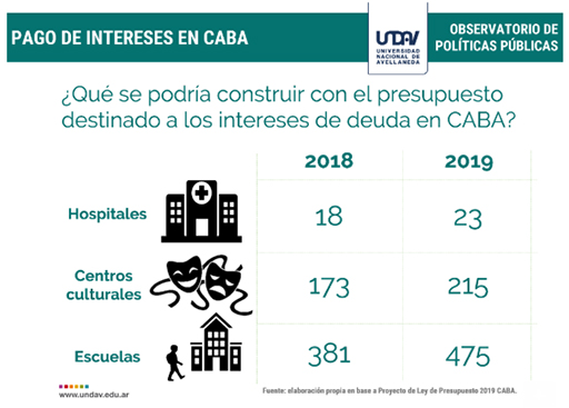En consonancia con lo planteado, se observa cómo, acorde al Presupuesto 2019, el peso del pago de intereses de la deuda subirá 3,5% respecto a este año y se llevará más del 8% del gasto total en la Ciudad Autónoma de Buenos Aires; es decir que el presupuesto del próximo año casi que duplicará el monto asignado a este año por gastos por intereses de la deuda.