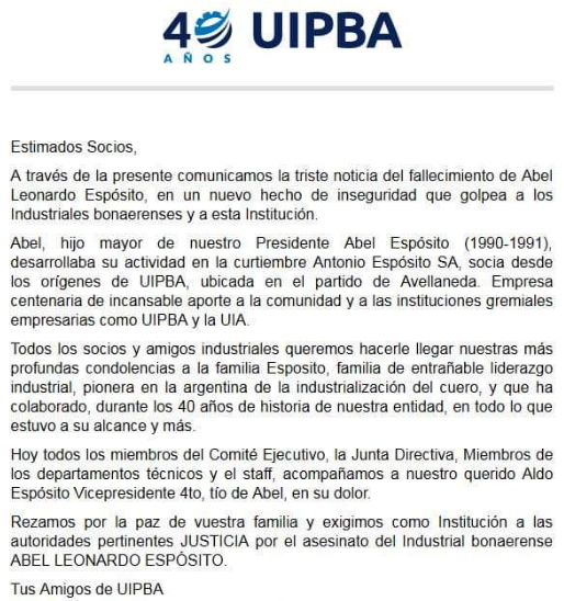 Pesar por el fallecimiento de Abel Leonardo Espósito