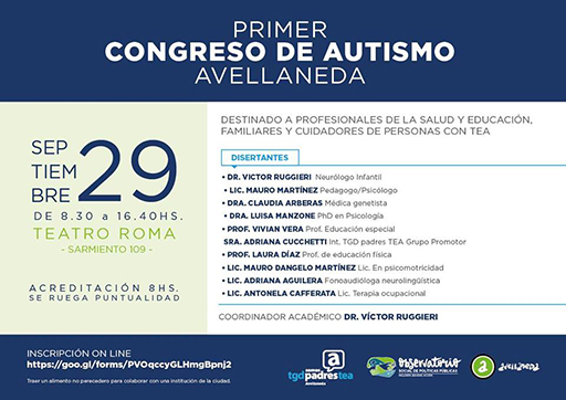 TGD Padres, TEA Avellaneda y el Observatorio Social de Políticas Públicas de Avellaneda invitan a participar del Primer Congreso de Autismo de Avellaneda en el Teatro Roma, Sarmiento 109. El encuentro será el sábado 29 de septiembre de 8.30 a 16.40 hs.