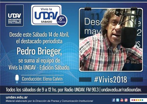 A partir del 14 de abril, Pedro Brieger, reconocido periodista y sociólogo argentino especializado en política internacional, suma su voz al aire de la FM 90.3 Radio UNDAV. Lo hará en el programa Vivís la UNDAV Edición Sábado, que se emite todos los sábados, de 9 a 12, en la emisora de la Universidad Nacional de Avellaneda (UNDAV).