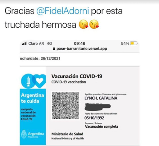 El domingo 26 de diciembre un usuario de Twitter identificado con el nombre de @FidelAdorni difundió en la red social una página web ilegal que generaba pases sanitarios truchos. Esta cuenta y web fueron denunciadas y ya se encuentran suspendidas, junto a otro perfil que actuaba de la misma manera. Por su parte, la usuaria @catalynch2 falsificó su pase sanitario con esta modalidad y lo publicó en su red social, quién también fue denunciada.