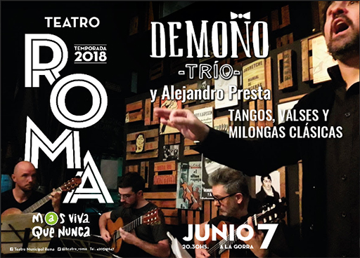 Demoño Trío es un grupo que rinde homenaje a una de las más características y persistentes formaciones tangueras: el trío de guitarras. Formado a comienzos de 2017 por Alejo Caramés (arreglos y dirección), Tomás Baquero y Julián Ceci, interpretan tangos, valses y milongas clásicas que recorren la historia del género en sus distintas etapas. Con la participación de Alejandro Presta como cantante invitado, se presentan en diferentes ámbitos y se encuentran abocados a la preparación de lo que será su primer trabajo discográfico, que incluirá piezas clásicas del tango como así también obras originales.