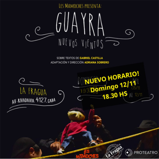 “Guayra..” es un espectáculo que a través de imágenes poéticas transcurren las historias que atraviesan lo más humano: los desencuentros, la imaginación y la creación, la naturaleza y sus mensajes; Historias que por sobre todas las cosas intentan homenajear a uno de los maestros más importantes que tiene la Argentina en la dramaturgia para títeres: Gabriel “Guaira” Castilla.