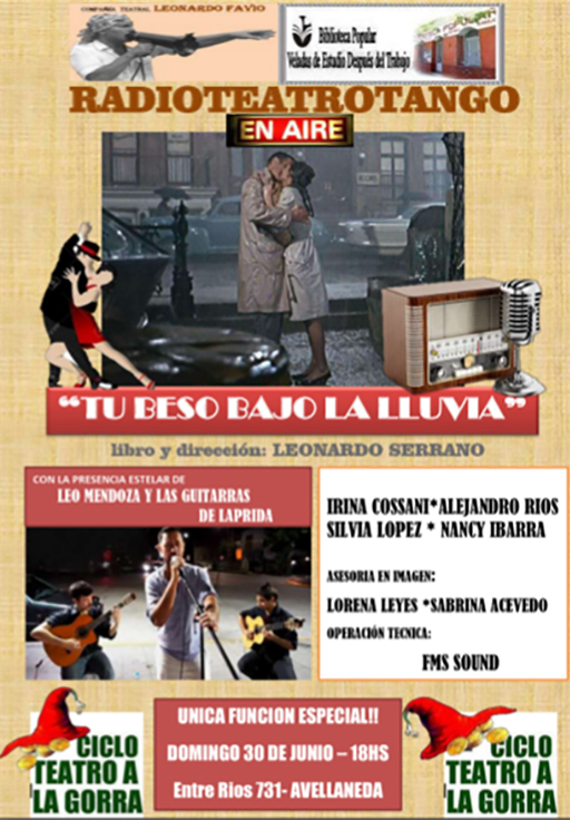 Este domingo 30 de junio a las 18hs, en la Biblioteca Veladas de Estudio Después del Trabajo de Piñyero -Entre Ríos 731- en el marco del ciclo “Teatro a la gorra”, Radioteatrogango en aire presenta “Tu beso bajo la lluvia” con libro y dirección de Leonardo Serrano y la participación de Irina Cossani, Mirta Mirabella, Rubén Mazzochi y Silvia López.