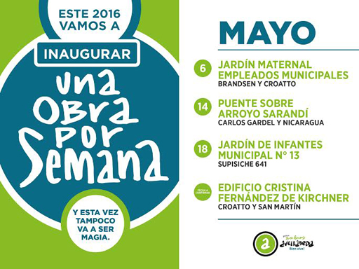 En ese marco, el cronograma será el siguiente: este viernes 6 de mayo se inaugurará el jardín maternal para empleados municipales, ubicado en la calle Brandsen, entre Croatto y Arenales. El sábado 14 será el turno del nuevo puente sobre el arroyo Sarandí, en Carlos Gardel y Nicaragua; mientras que el 18, quedará oficialmente inaugurado el jardín de infantes municipal Nº 13, sito en Supisiche 641. Para finales de mes se prevé la inauguración del nuevo edificio Cristina Fernández de Kirchner, ubicado en las calles San Martín y Croatto.