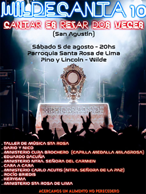 Participan el Taller de música Santa Rosa, Darío y Nico, Ministerio Cura Brochero (Capilla Medalla Milagrosa), Eduardo Dacuña, Ministerio Nuestra Señora del Carmen, Cara a Cara, Ministerio Carlo Acutis (Nuestra Señora de La Paz, Rocío Briedis, Kerysma y Ministerio de Santa Rosa de Lima.